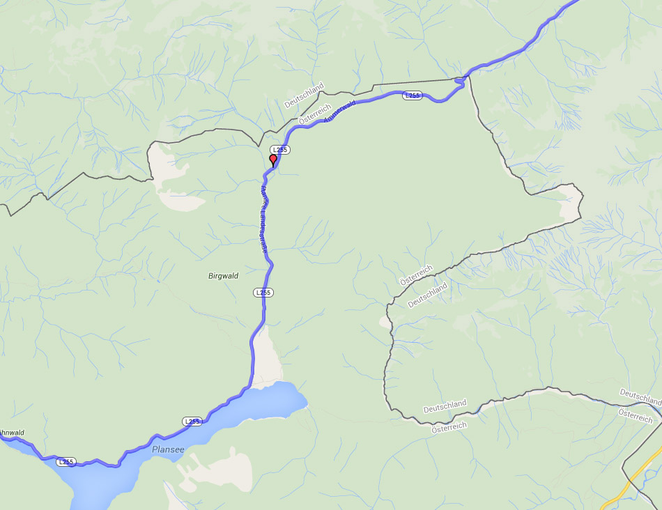 The action started pretty much immediately and nothing could prepare us for the very first leg. The run by the side of lake Plansee was a lovely twisty and scenic intro and then heading north toward the border, the L255 followed an offshoot river and opened out into one of the very fastest roads i've been on. Amazing high speed sweepers, lots of little red bridges crossing the river this way and that, some big big straights, passing the hotel Ammerwald located roughly at the red marker in my picture, plenty of wooded sections and the odd descending hairpin thrown into the mix as well. A very memorable high speed run, this was the very essence of Austria and why for me, it is the finest driving country in Europe (until proven otherwise).